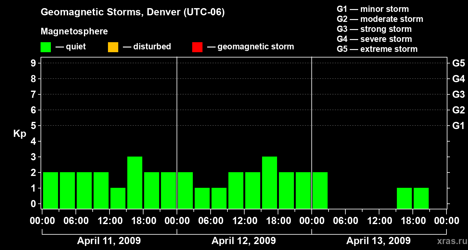Changes in the geomagnetic index Kp from April 11 to 13, 2009 for mid latitudes