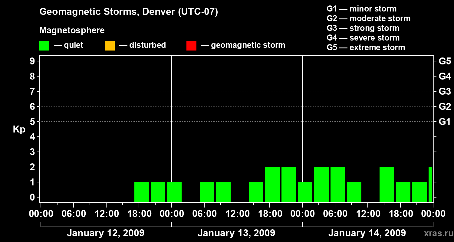 Changes in the geomagnetic index Kp from January 12 to 14, 2009 for mid latitudes