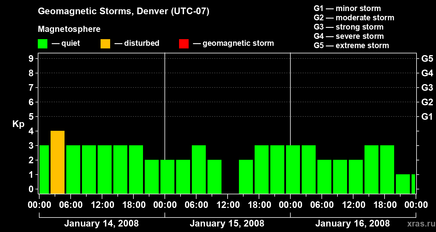 Changes in the geomagnetic index Kp from January 14 to 16, 2008 for mid latitudes