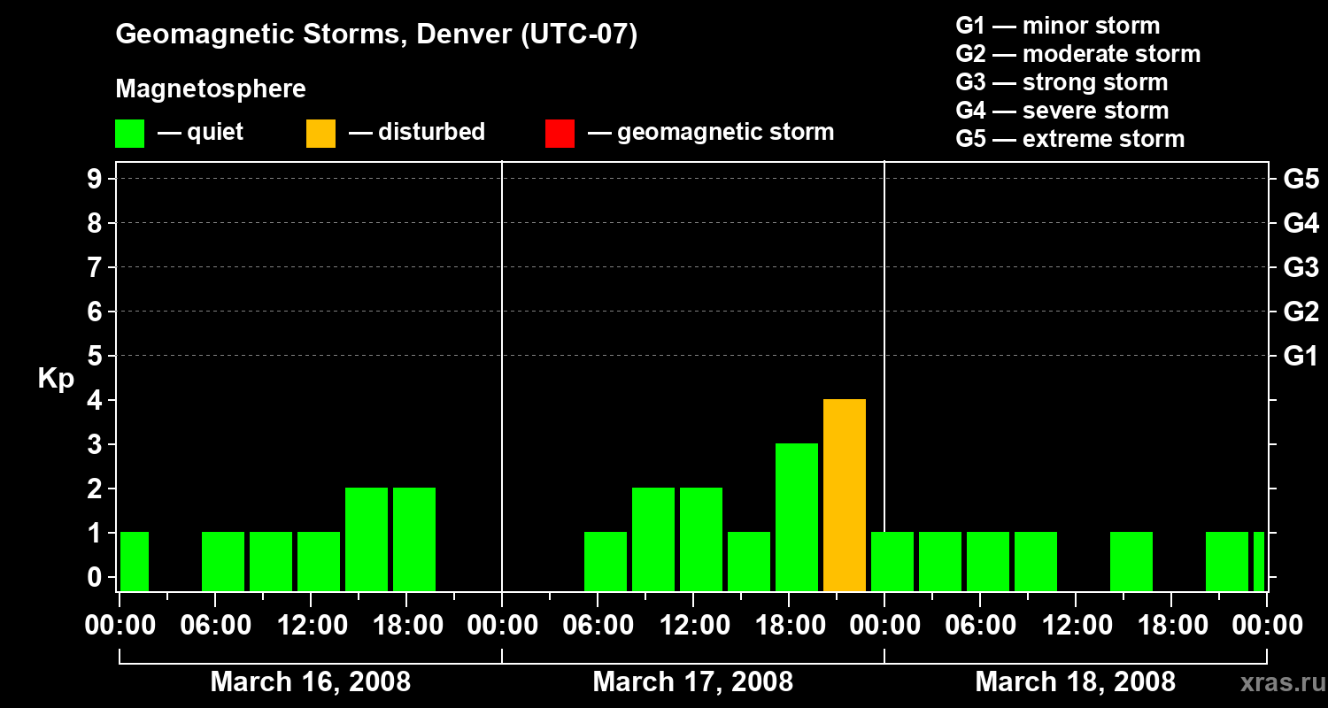 Changes in the geomagnetic index Kp from March 16 to 18, 2008 for mid latitudes