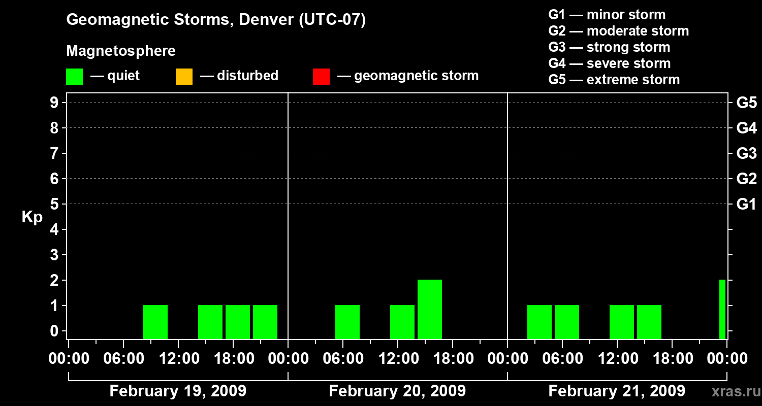 Changes in the geomagnetic index Kp from February 19 to 21, 2009 for mid latitudes