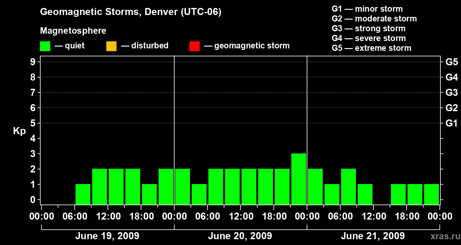 Changes in the geomagnetic index Kp from June 19 to 21, 2009 for mid latitudes