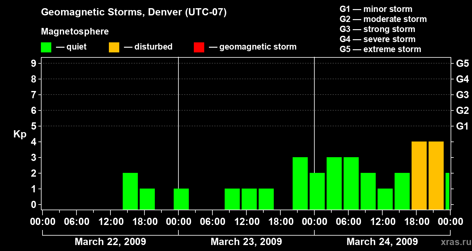 Changes in the geomagnetic index Kp from March 22 to 24, 2009 for mid latitudes