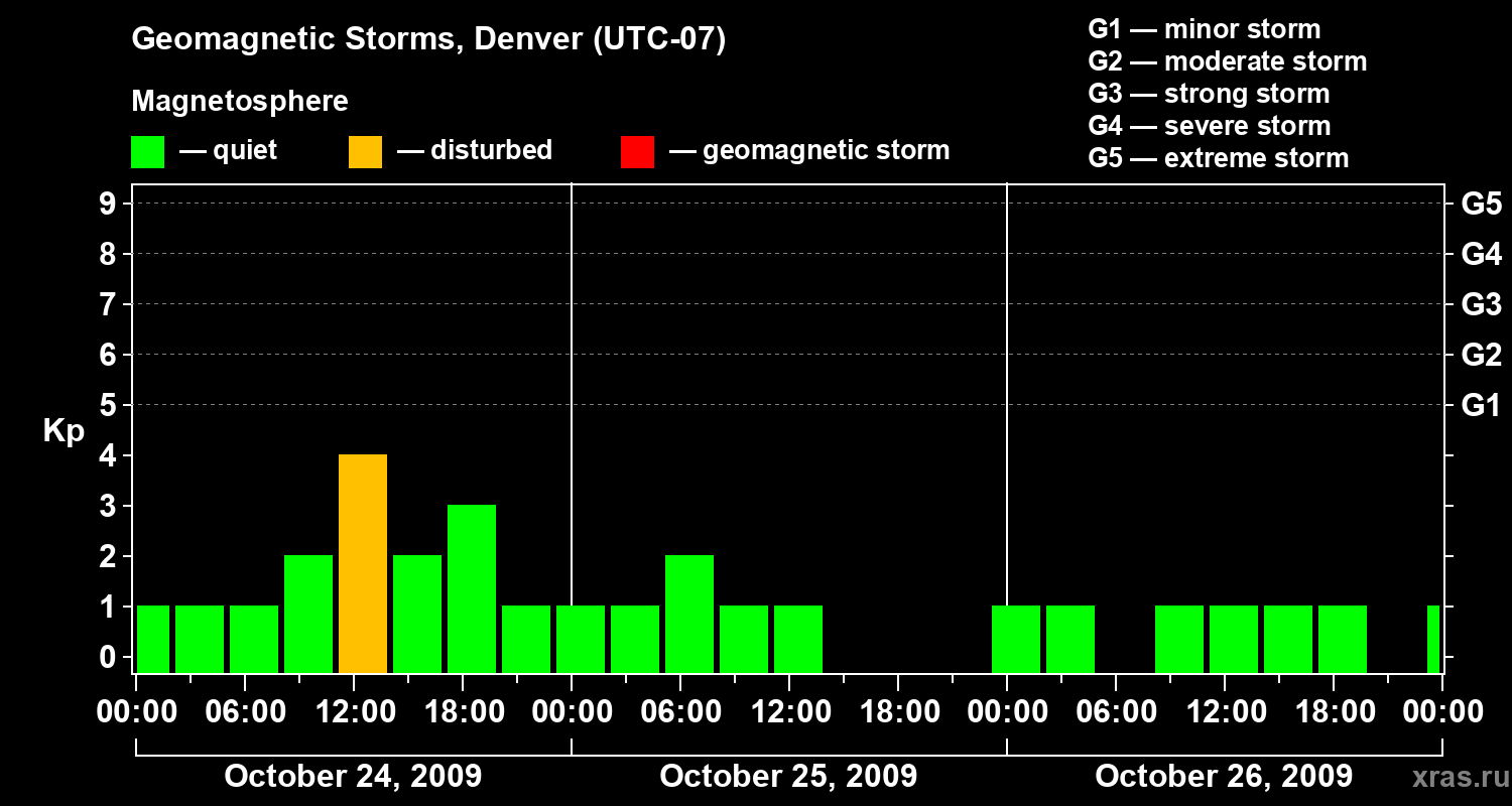 Changes in the geomagnetic index Kp from October 24 to 26, 2009 for mid latitudes
