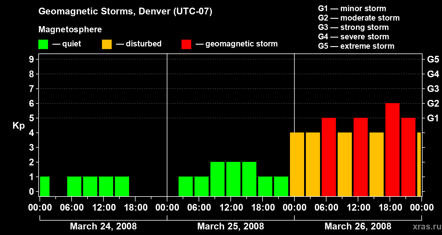Changes in the geomagnetic index Kp from March 24 to 26, 2008 for mid latitudes