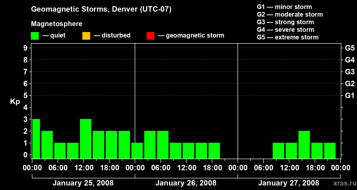 Changes in the geomagnetic index Kp from January 25 to 27, 2008 for mid latitudes