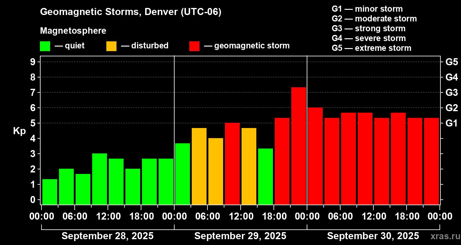 Changes in the geomagnetic index Kp from September 28 to 30, 2025 for mid latitudes