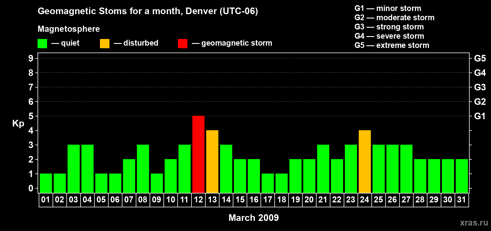 Changes in the maximum daily geomagnetic index Kp in March 2009 for mid latitudes