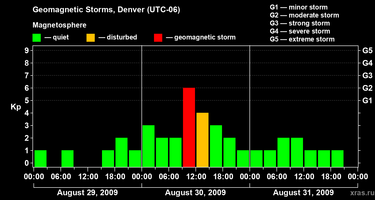 Changes in the geomagnetic index Kp from August 29 to 31, 2009 for mid latitudes