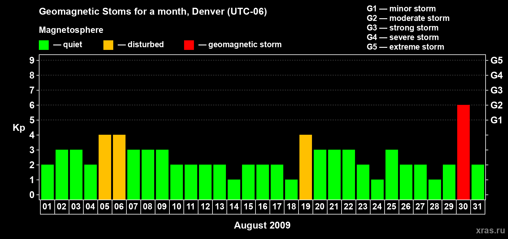 Changes in the maximum daily geomagnetic index Kp in August 2009 for mid latitudes