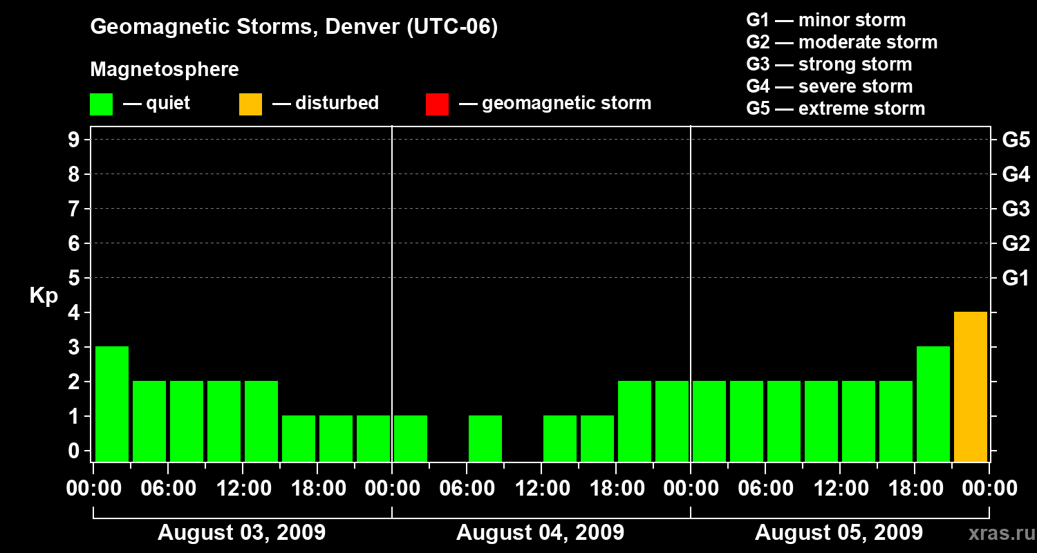 Changes in the geomagnetic index Kp from August 3 to 5, 2009 for mid latitudes