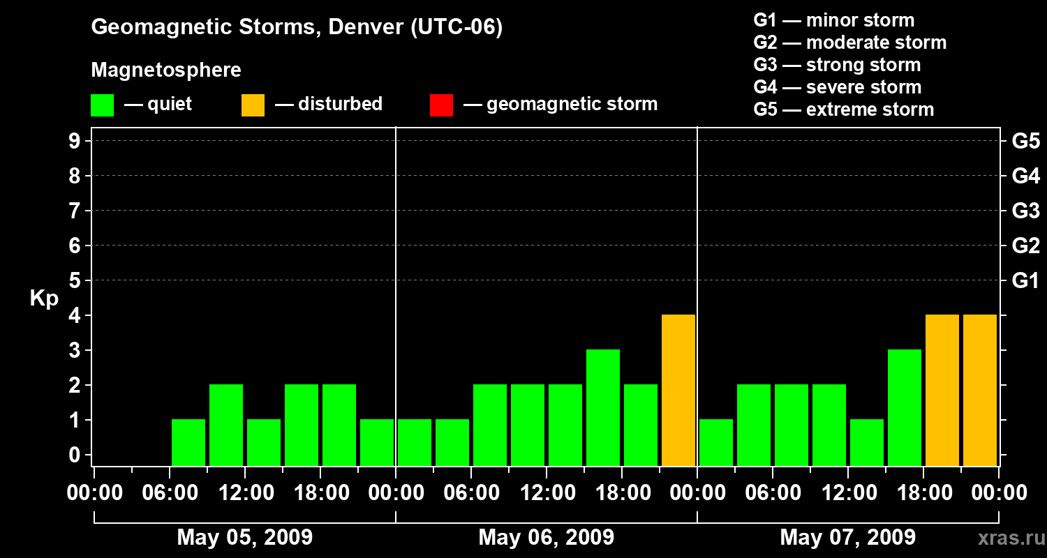 Changes in the geomagnetic index Kp from May 5 to 7, 2009 for mid latitudes