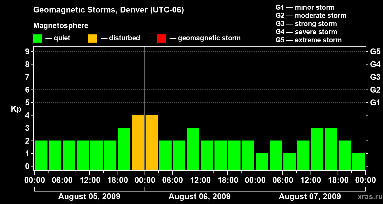 Changes in the geomagnetic index Kp from August 5 to 7, 2009 for mid latitudes