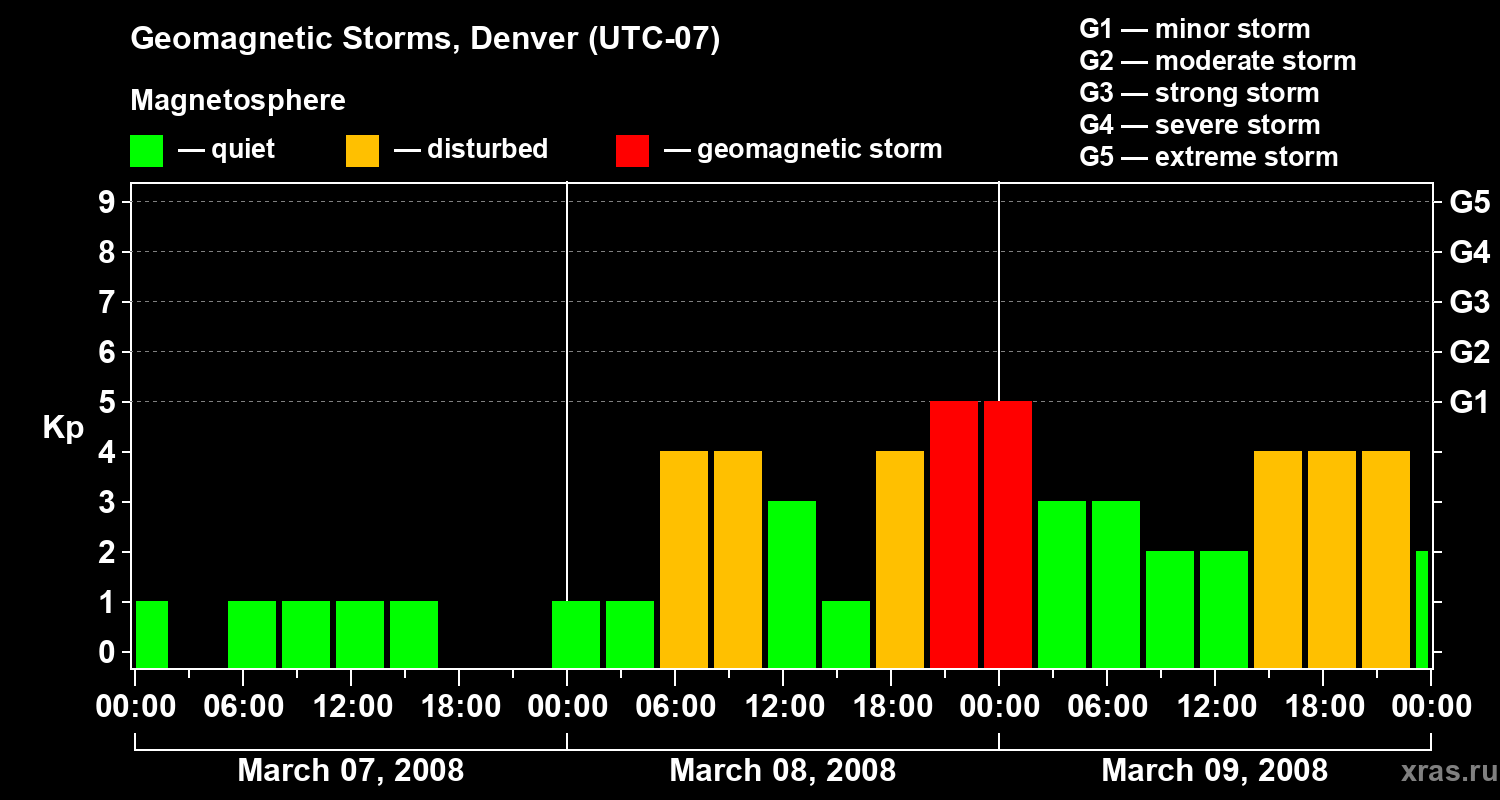 Changes in the geomagnetic index Kp from March 7 to 9, 2008 for mid latitudes