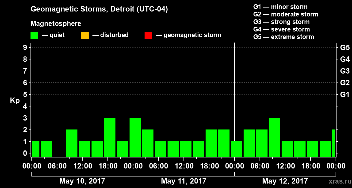 Changes in the geomagnetic index Kp from May 10 to 12, 2017 for mid latitudes