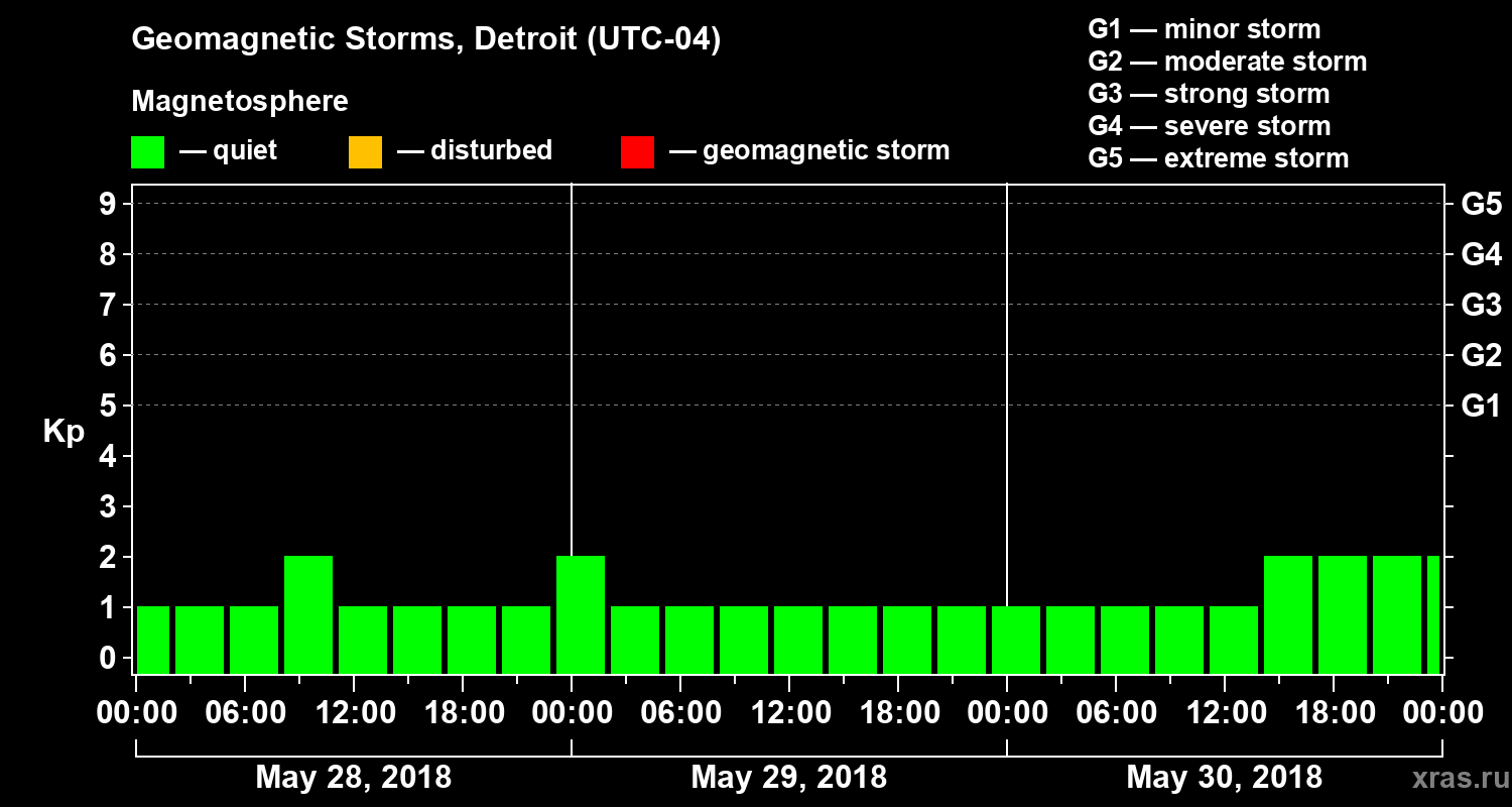 Changes in the geomagnetic index Kp from May 28 to 30, 2018 for mid latitudes