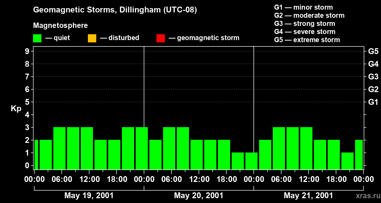 Changes in the geomagnetic index Kp from May 19 to 21, 2001 for mid latitudes