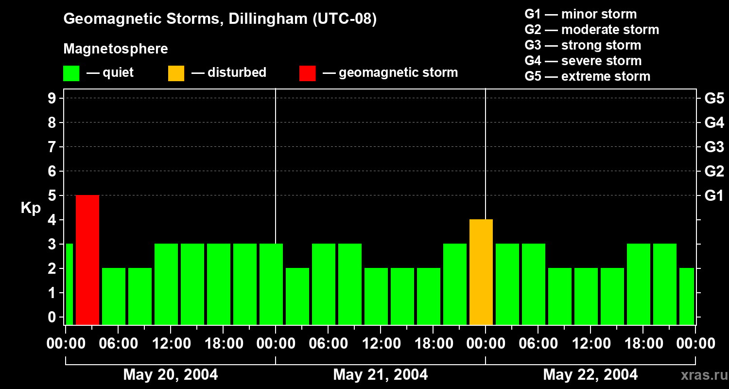 Changes in the geomagnetic index Kp from May 20 to 22, 2004 for mid latitudes