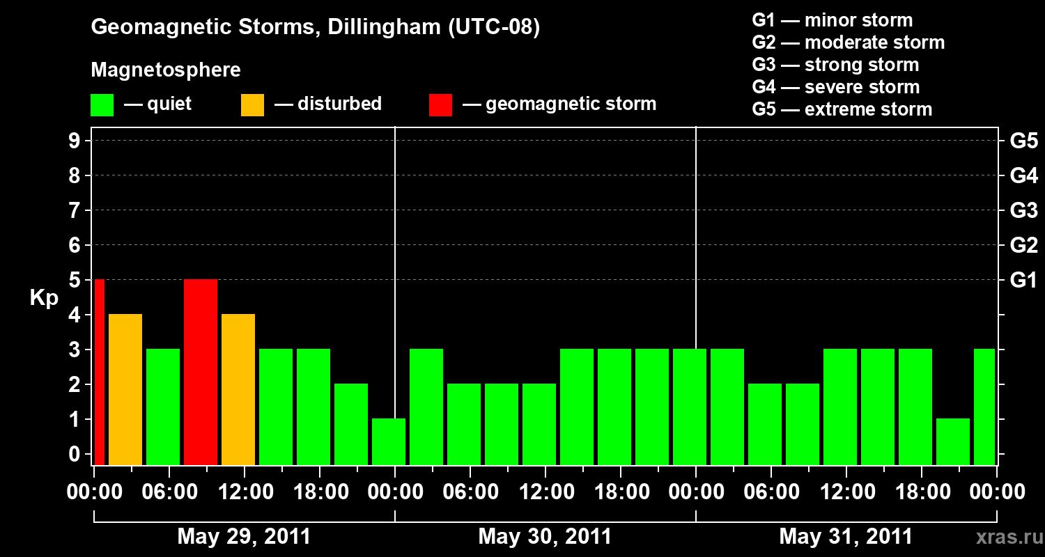 Changes in the geomagnetic index Kp from May 29 to 31, 2011 for mid latitudes