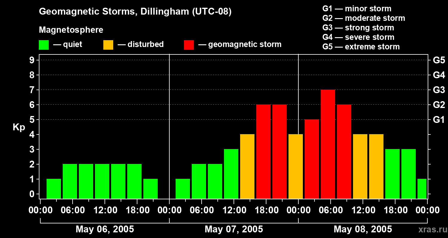 Changes in the geomagnetic index Kp from May 6 to 8, 2005 for mid latitudes