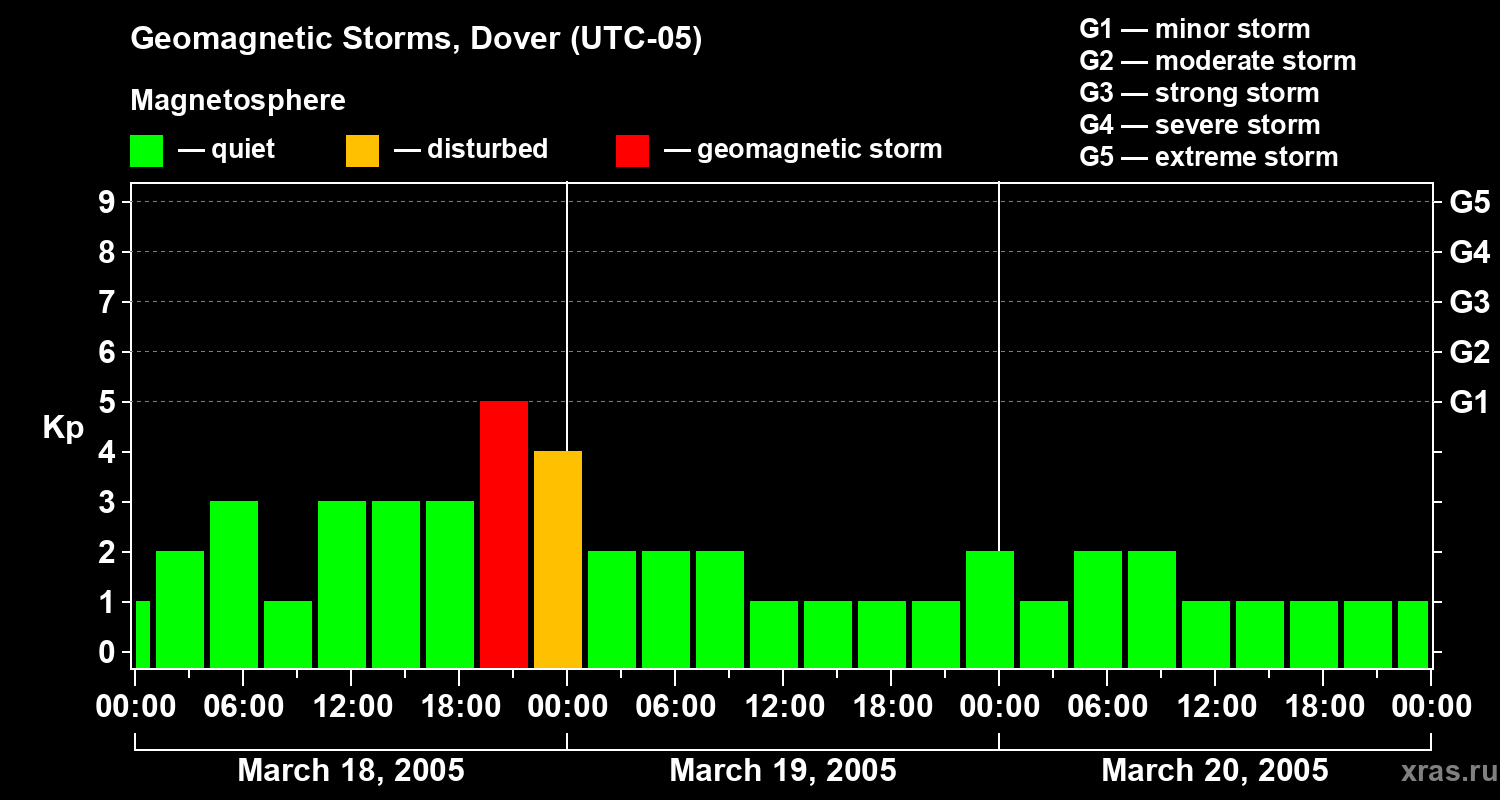 Changes in the geomagnetic index Kp from March 18 to 20, 2005 for mid latitudes
