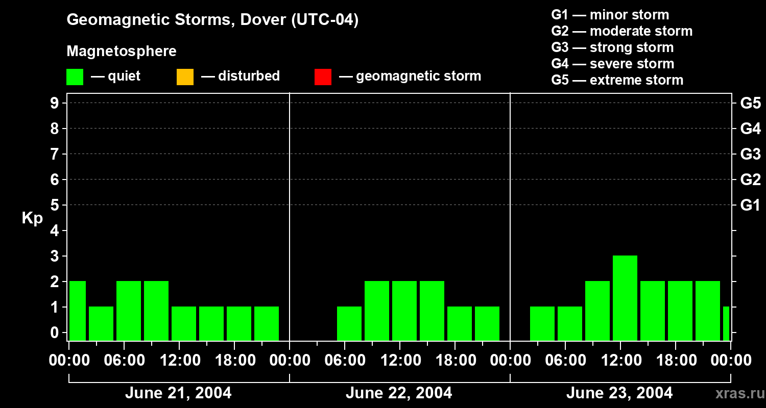 Changes in the geomagnetic index Kp from June 21 to 23, 2004 for mid latitudes