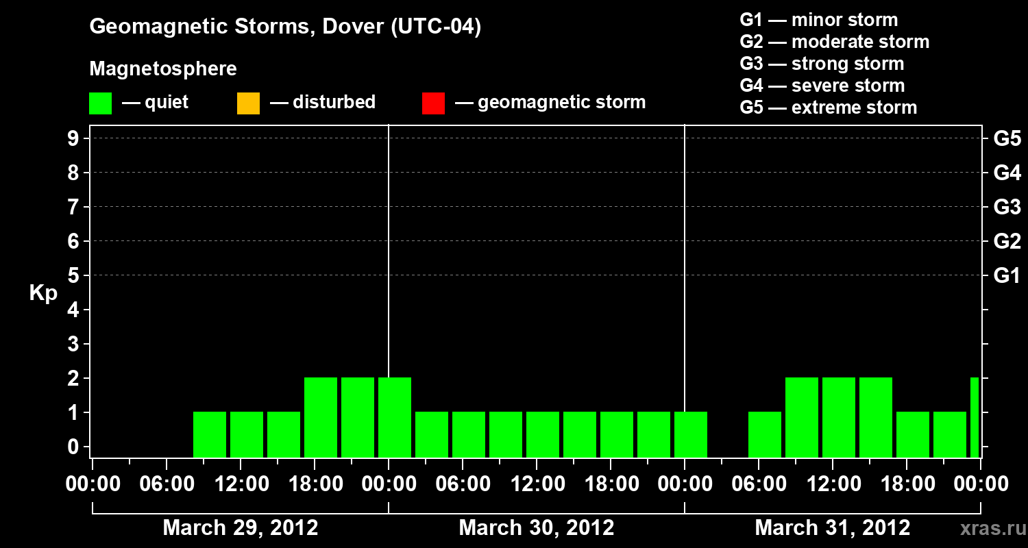 Changes in the geomagnetic index Kp from March 29 to 31, 2012 for mid latitudes