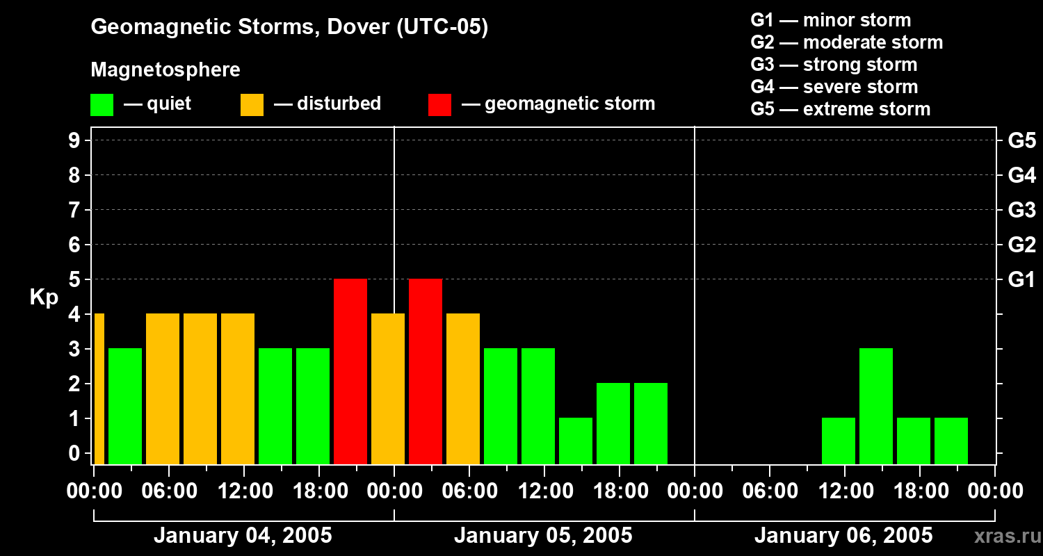 Changes in the geomagnetic index Kp from January 4 to 6, 2005 for mid latitudes