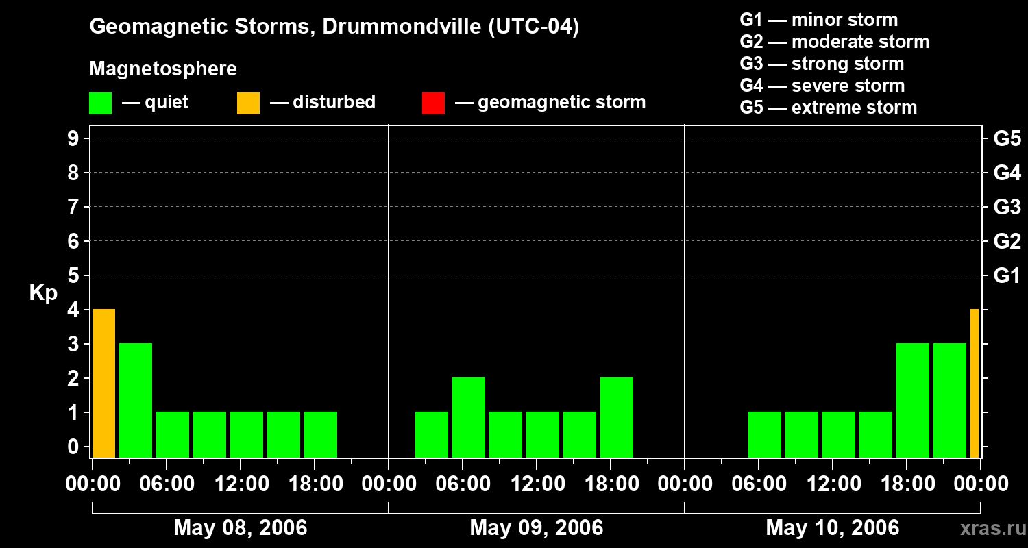 Changes in the geomagnetic index Kp from May 8 to 10, 2006 for mid latitudes