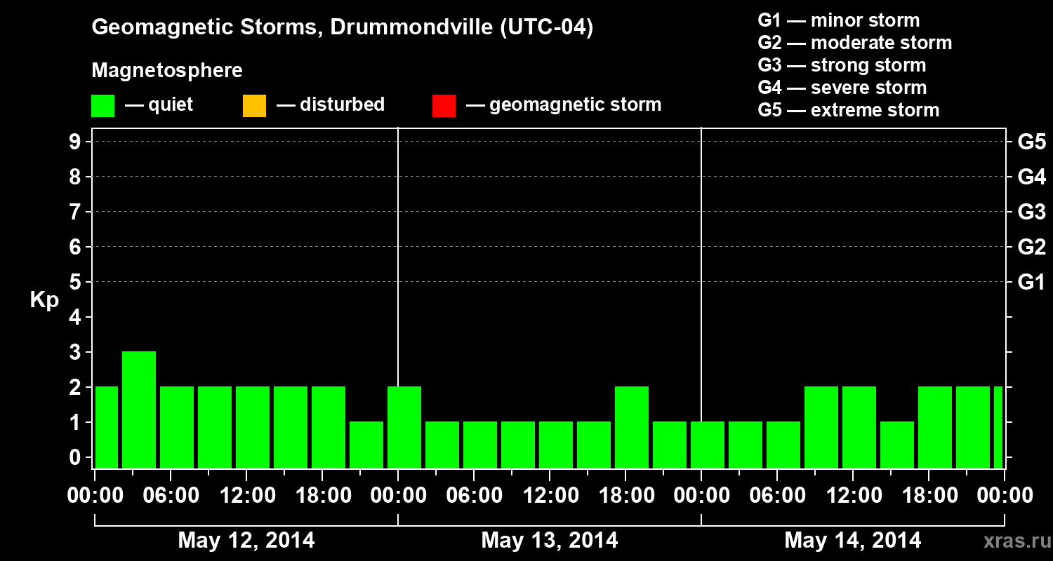 Changes in the geomagnetic index Kp from May 12 to 14, 2014 for mid latitudes