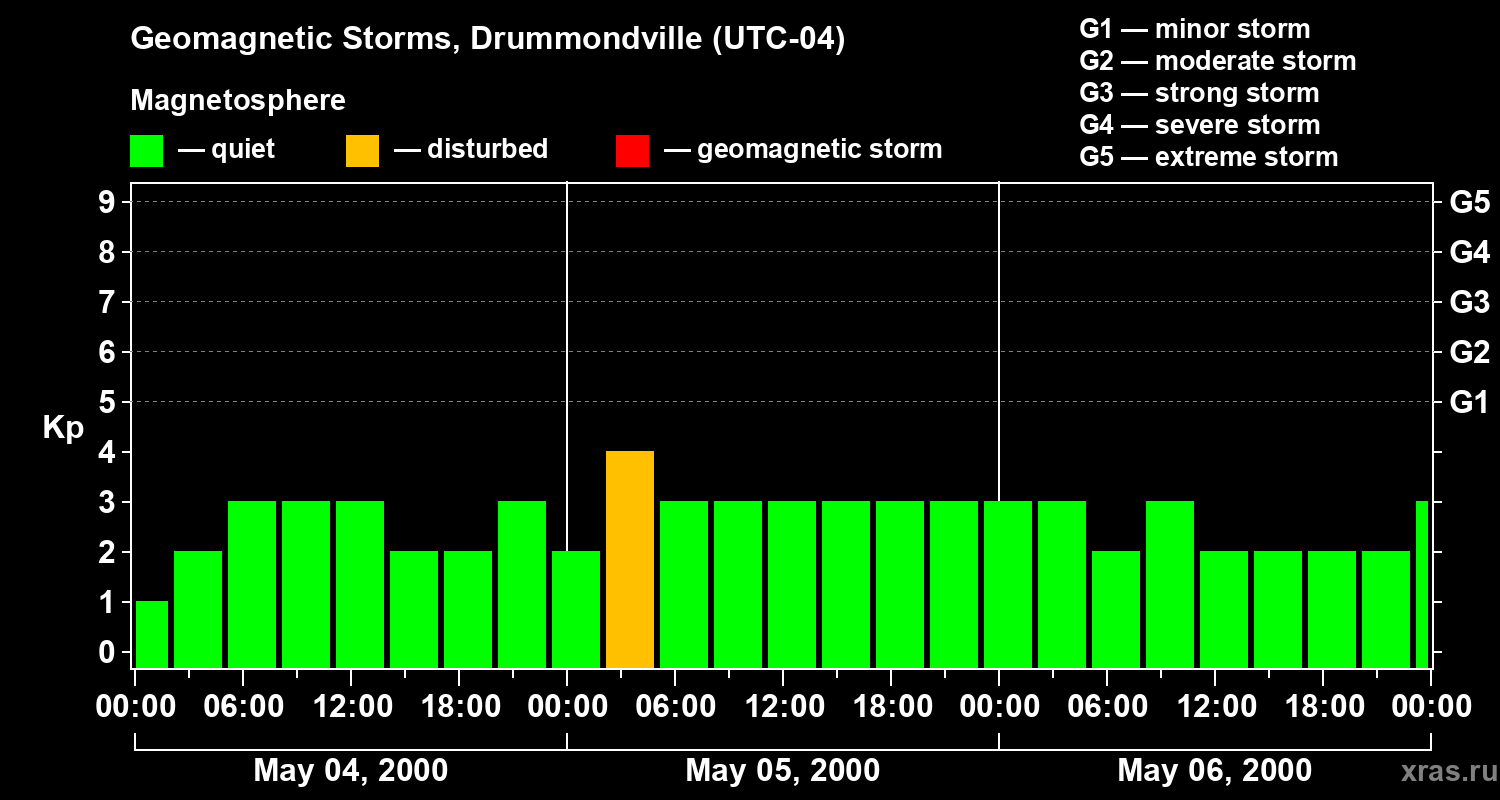 Changes in the geomagnetic index Kp from May 4 to 6, 2000 for mid latitudes