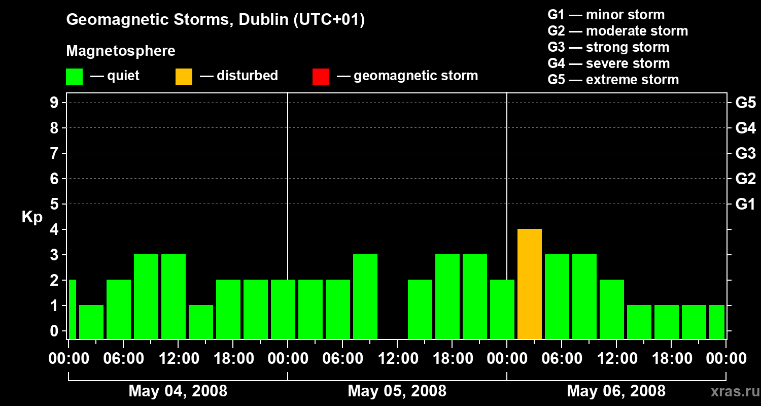 Changes in the geomagnetic index Kp from May 4 to 6, 2008 for mid latitudes