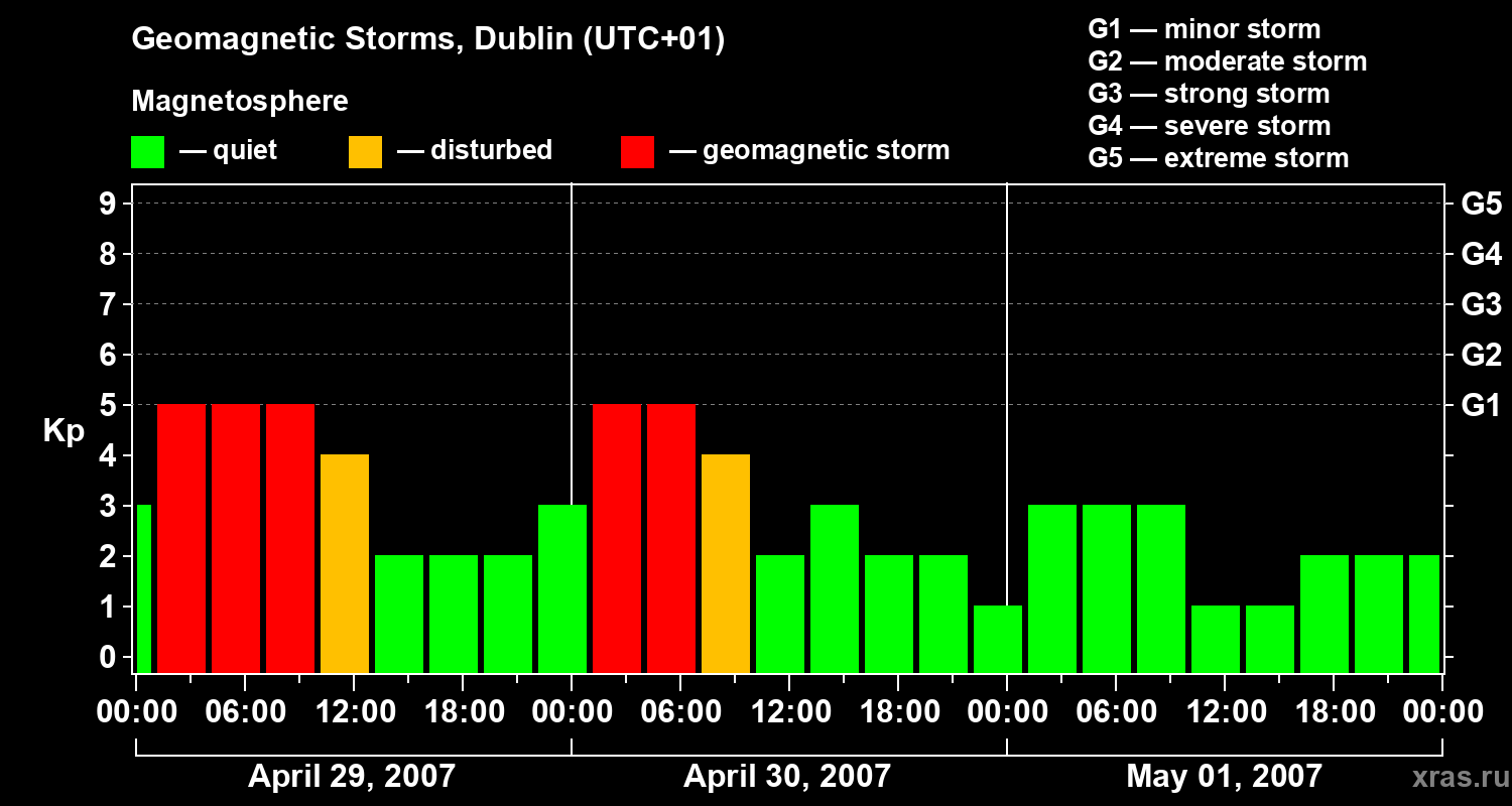 Changes in the geomagnetic index Kp from April 29 to May 1, 2007 for mid latitudes