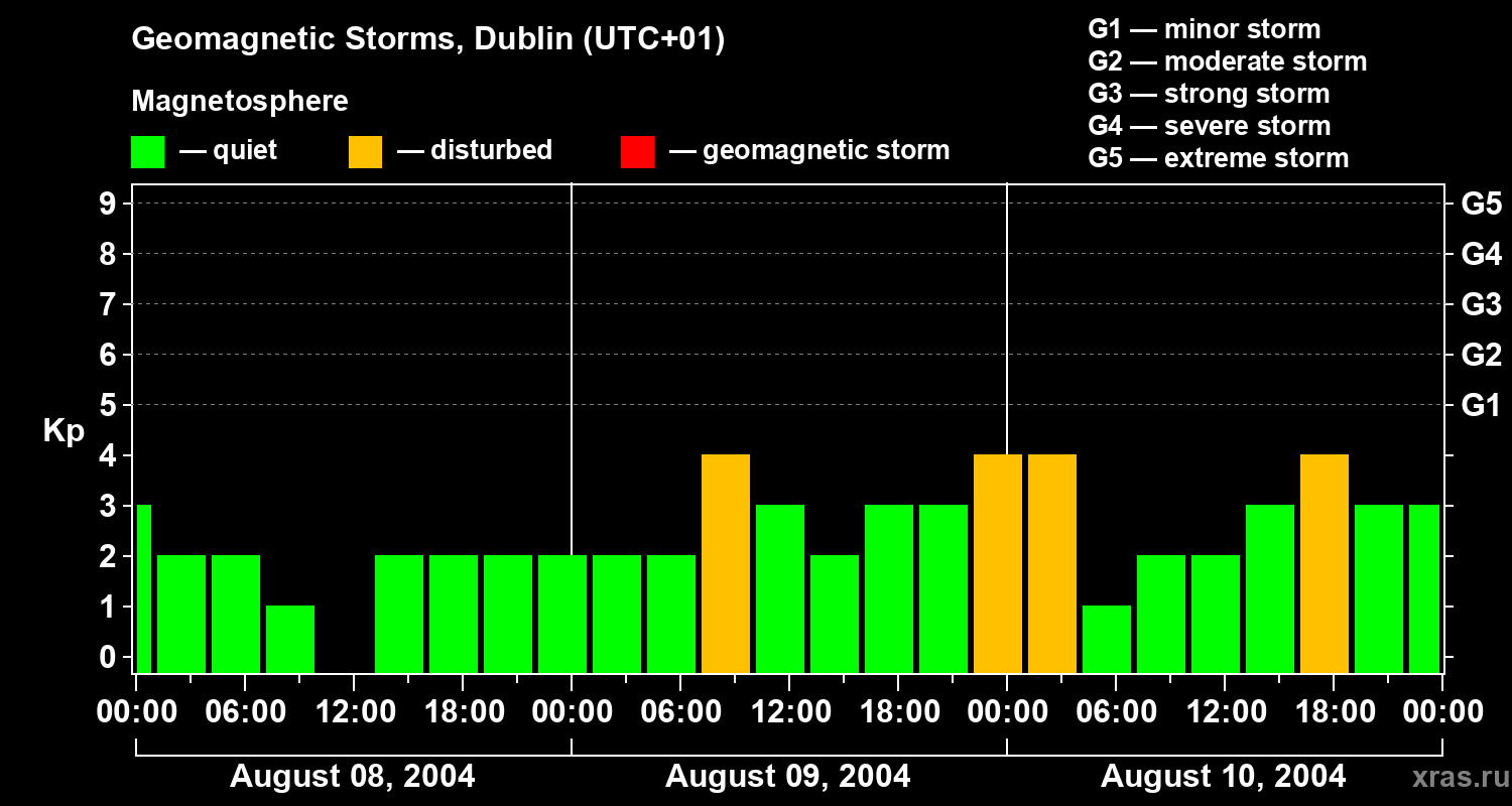 Geomagnetic storms in Dublin on Aug 10, 2004