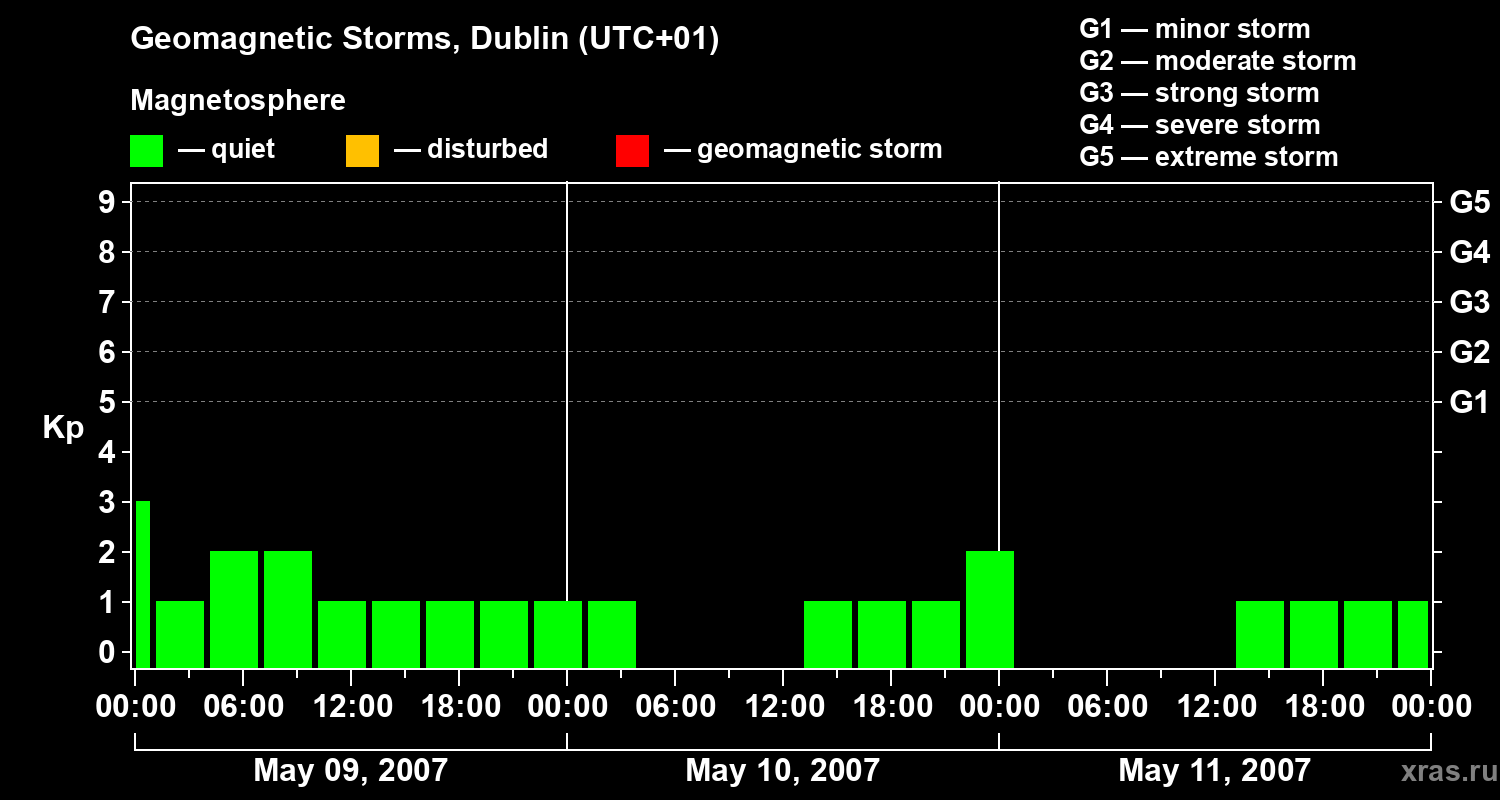 Changes in the geomagnetic index Kp from May 9 to 11, 2007 for mid latitudes