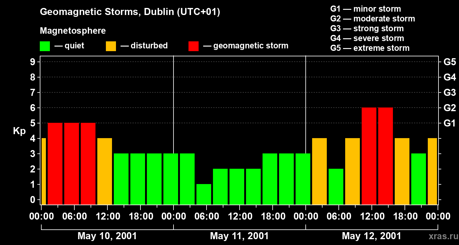 Changes in the geomagnetic index Kp from May 10 to 12, 2001 for mid latitudes