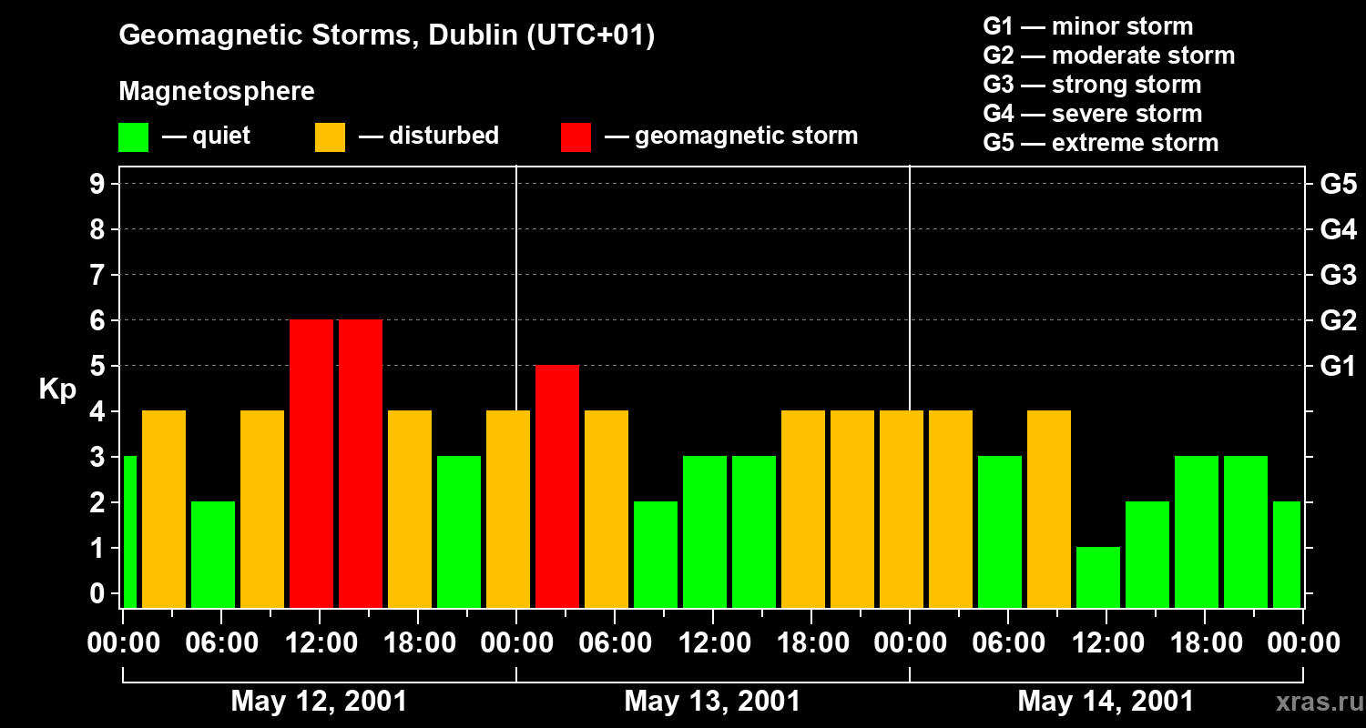 Changes in the geomagnetic index Kp from May 12 to 14, 2001 for mid latitudes