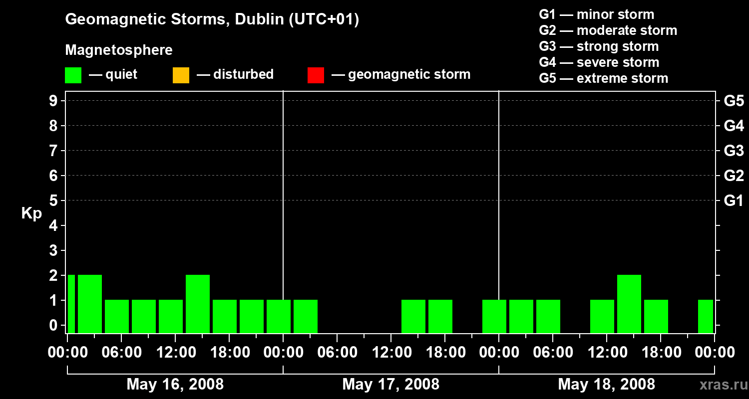 Changes in the geomagnetic index Kp from May 16 to 18, 2008 for mid latitudes
