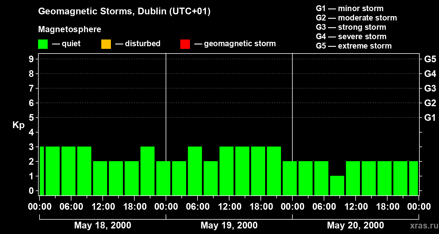 Changes in the geomagnetic index Kp from May 18 to 20, 2000 for mid latitudes