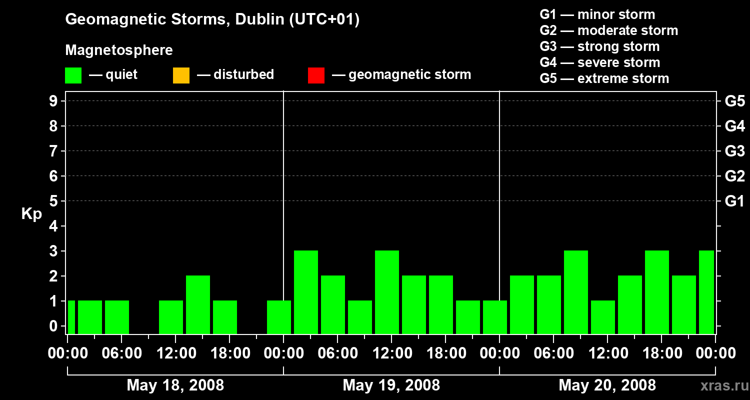 Changes in the geomagnetic index Kp from May 18 to 20, 2008 for mid latitudes