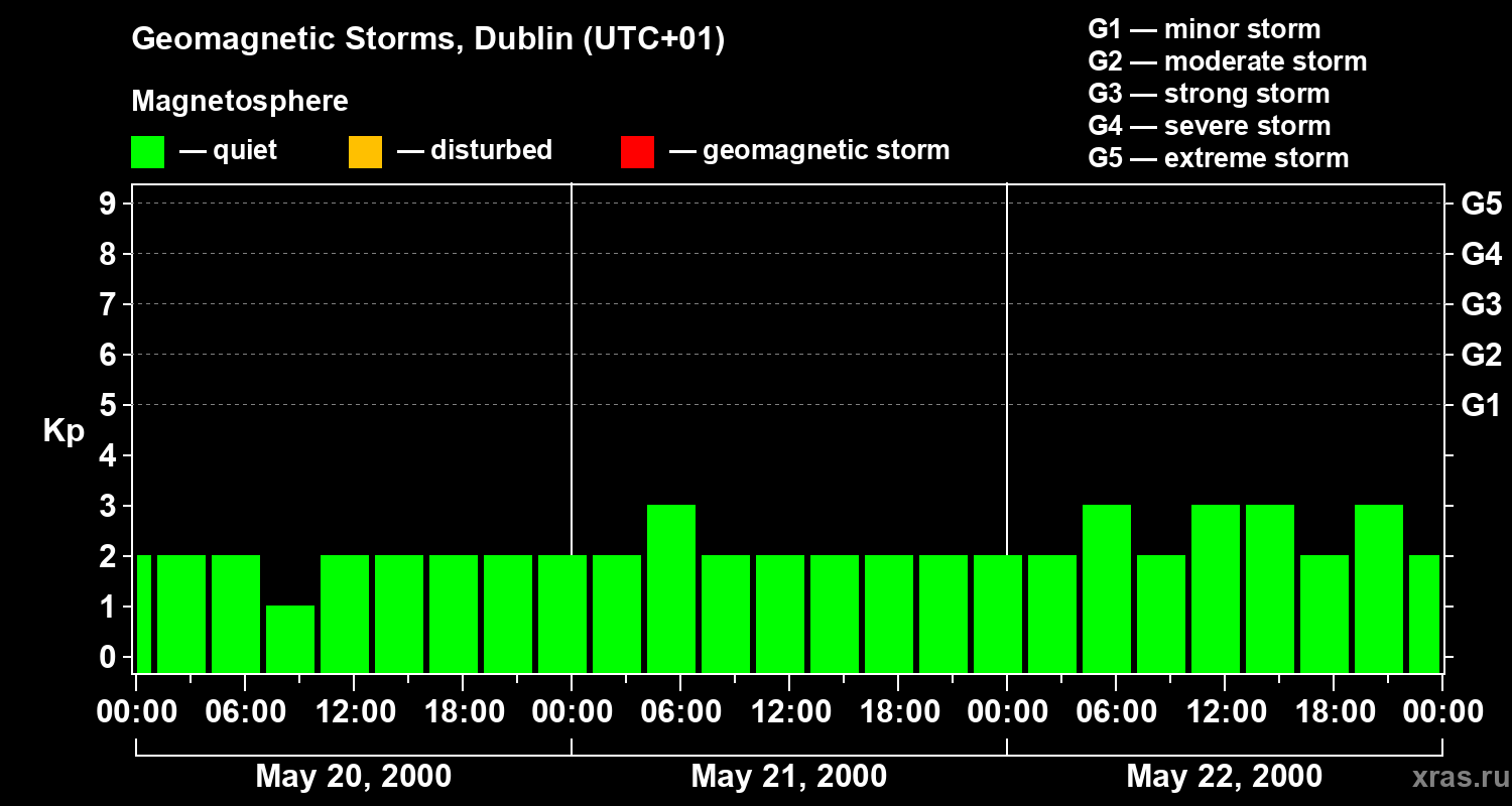 Changes in the geomagnetic index Kp from May 20 to 22, 2000 for mid latitudes