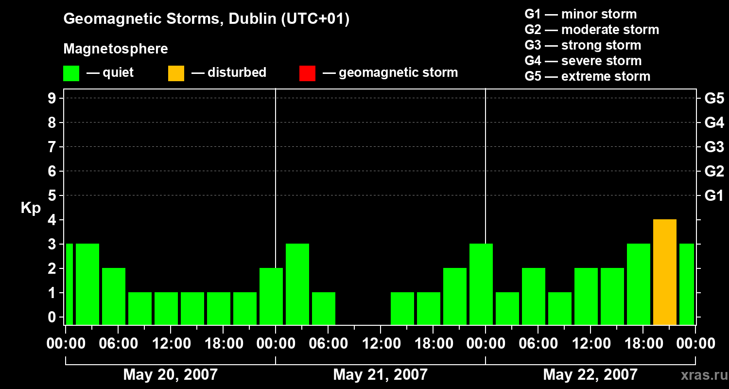 Changes in the geomagnetic index Kp from May 20 to 22, 2007 for mid latitudes