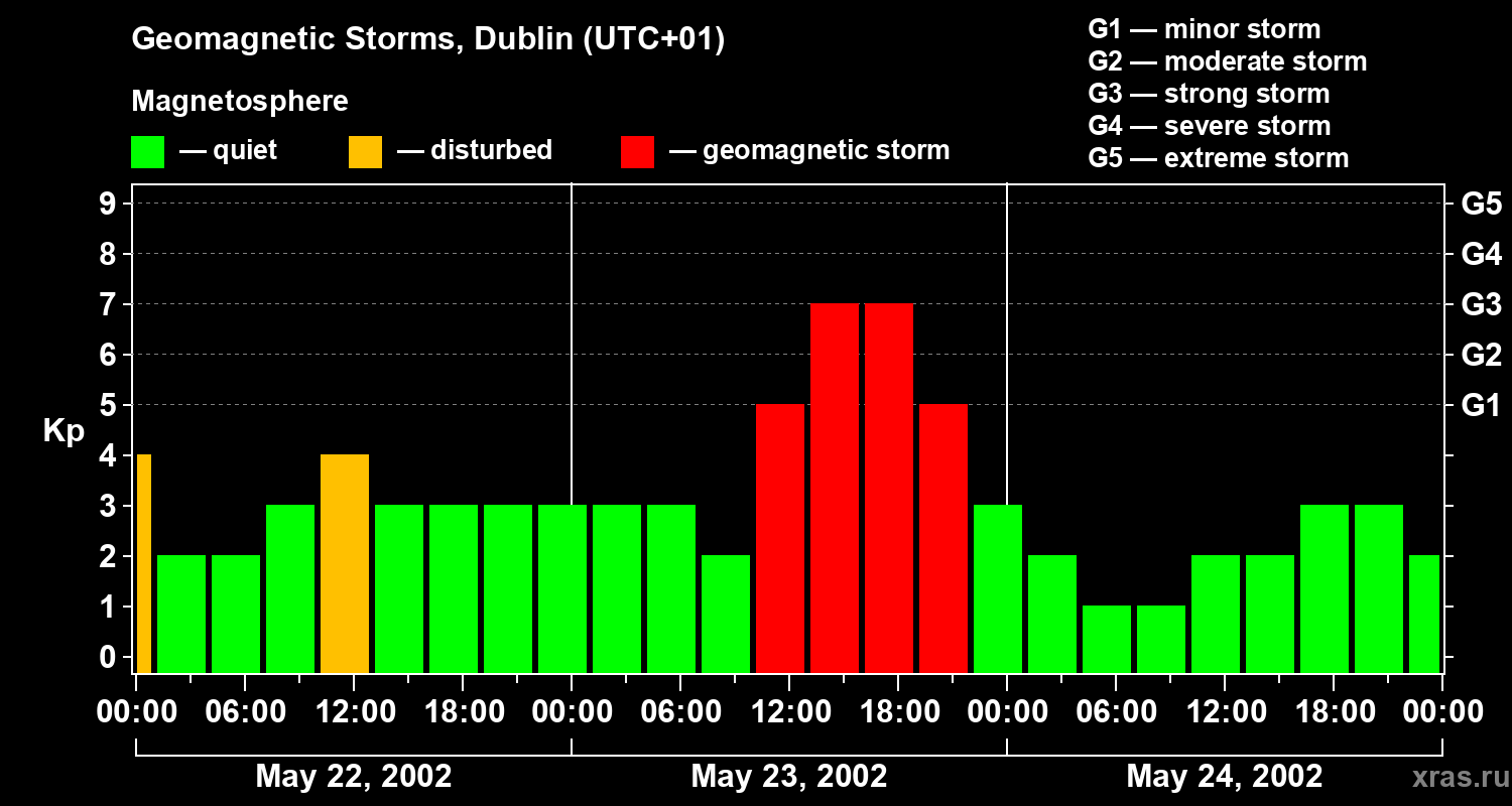 Changes in the geomagnetic index Kp from May 22 to 24, 2002 for mid latitudes