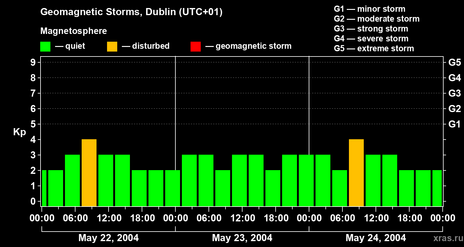 Changes in the geomagnetic index Kp from May 22 to 24, 2004 for mid latitudes