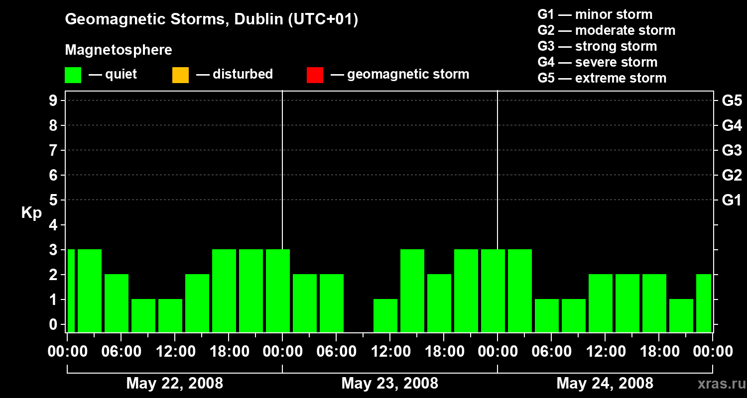 Changes in the geomagnetic index Kp from May 22 to 24, 2008 for mid latitudes