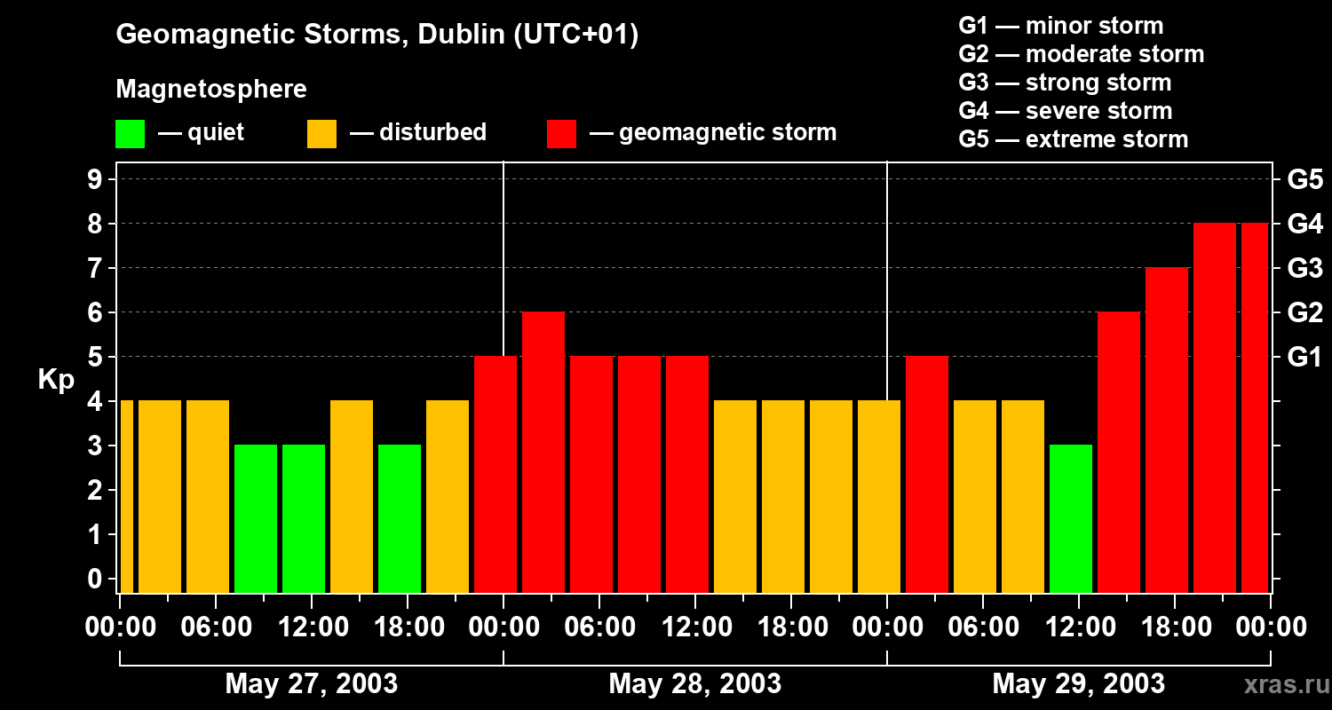 Changes in the geomagnetic index Kp from May 27 to 29, 2003 for mid latitudes