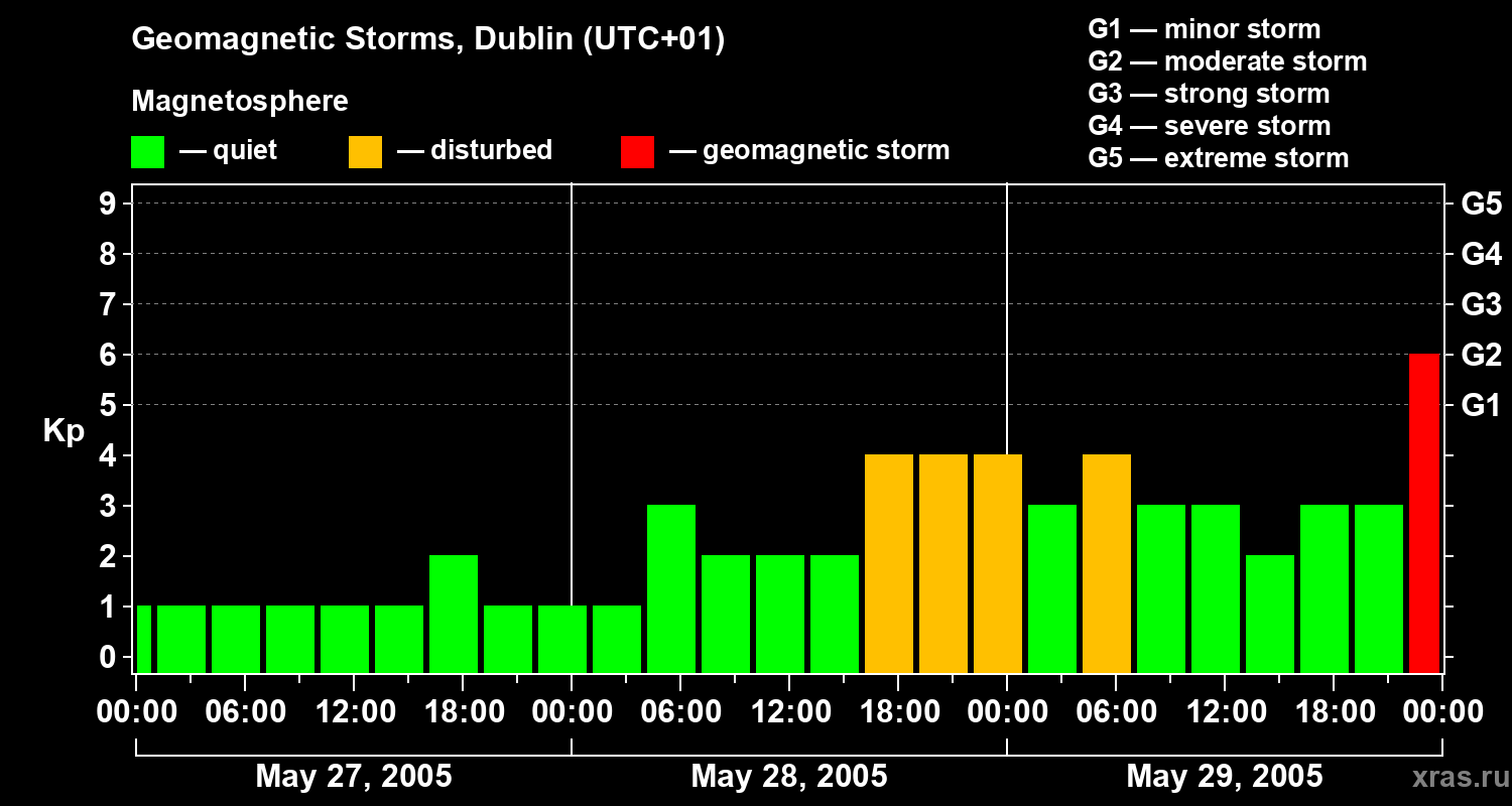 Changes in the geomagnetic index Kp from May 27 to 29, 2005 for mid latitudes