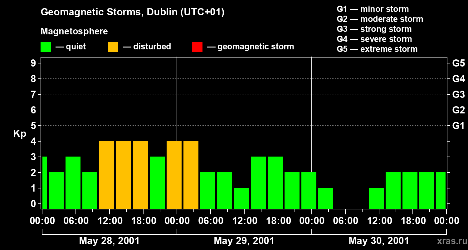 Changes in the geomagnetic index Kp from May 28 to 30, 2001 for mid latitudes