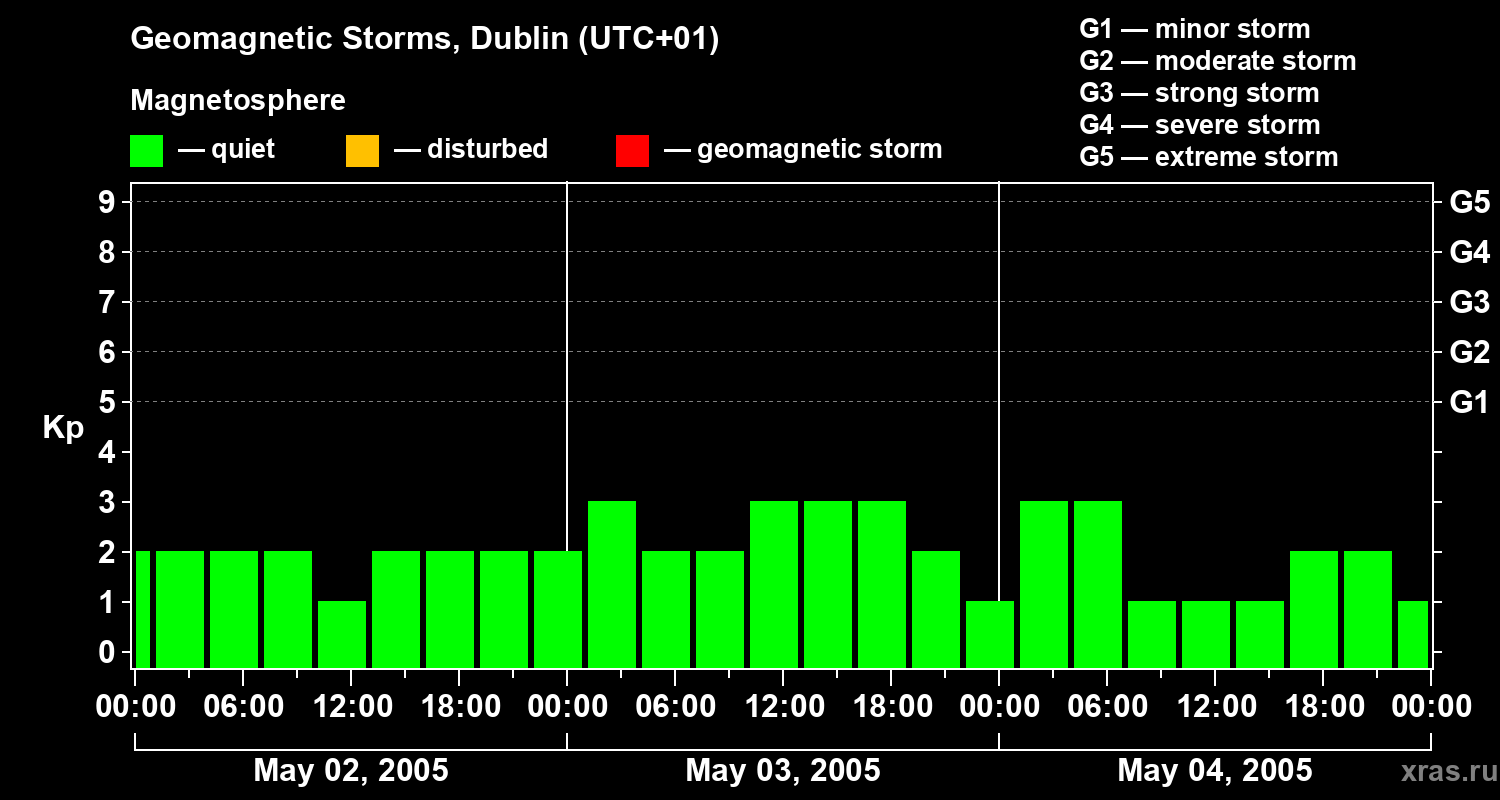 Changes in the geomagnetic index Kp from May 2 to 4, 2005 for mid latitudes