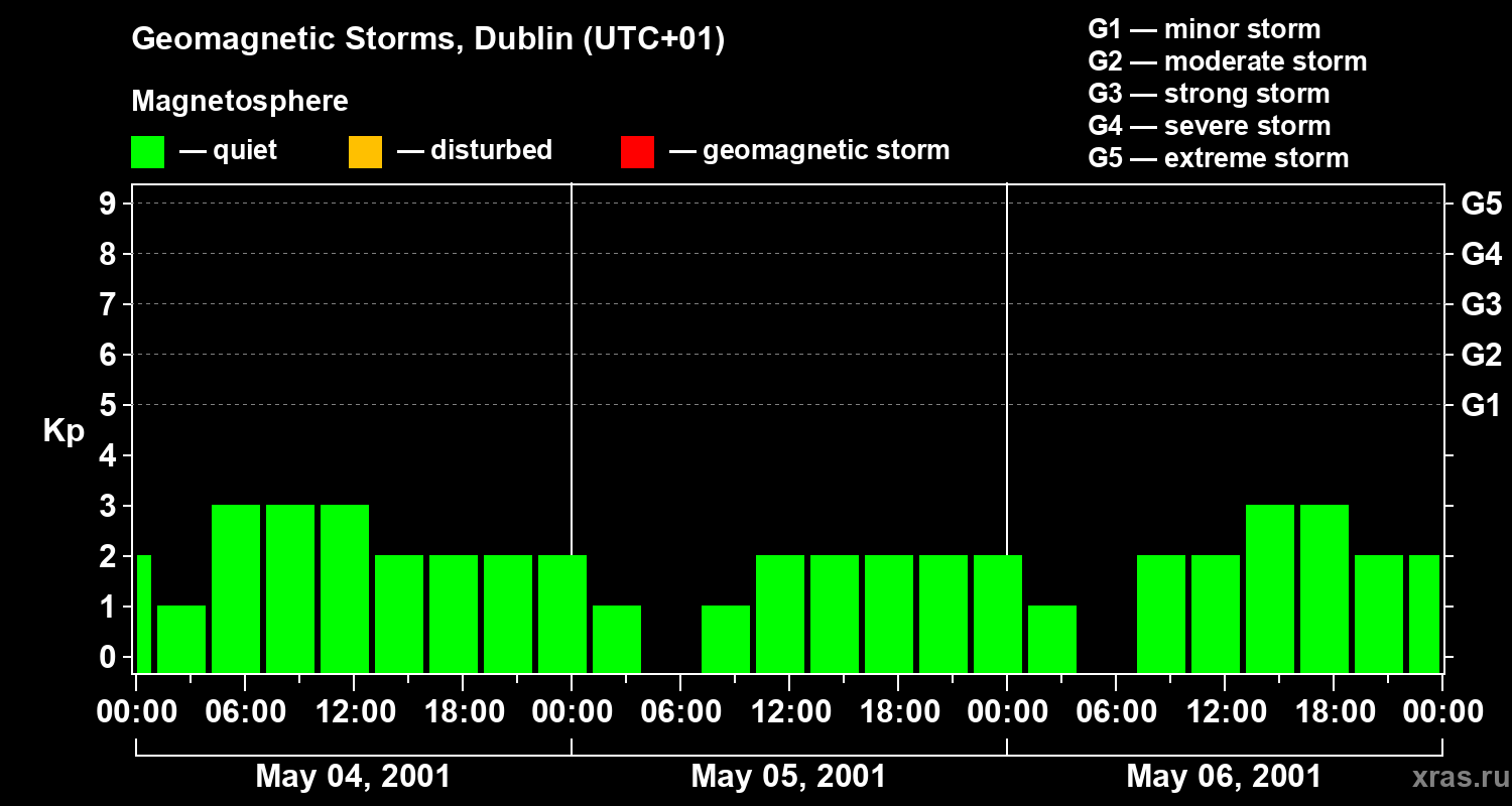 Changes in the geomagnetic index Kp from May 4 to 6, 2001 for mid latitudes